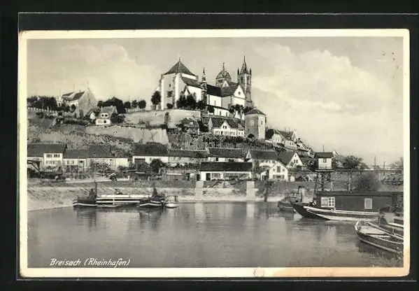AK Breisach, Rheinhafen mit Booten und Kirche