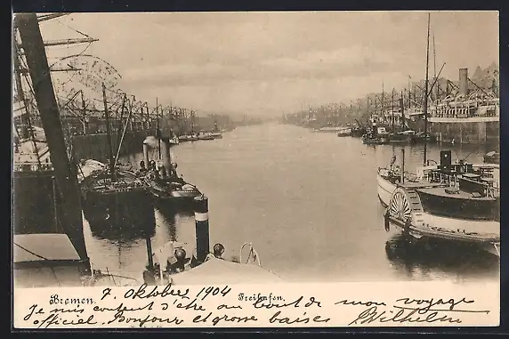 AK Bremen, Freihafen, Raddampfer, Lastkähne, Schiffe
