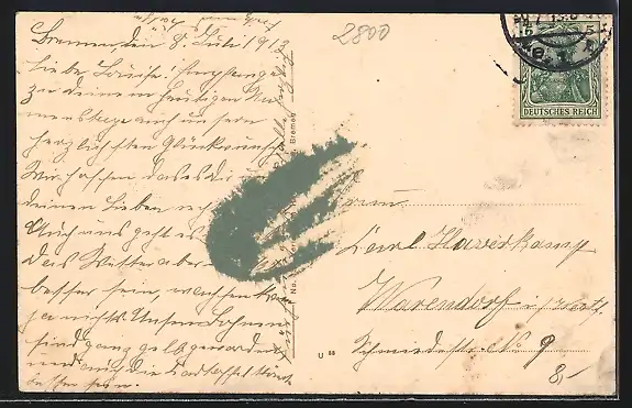 Personenbezogene Daten auf der Rückseite der Karte wurden durch blauen Textmarker unkenntlich gemacht. Die blauen Stellen sind auf die Vorderseite durchgeweicht und wirken sich negativ auf das Postkartenfoto aus