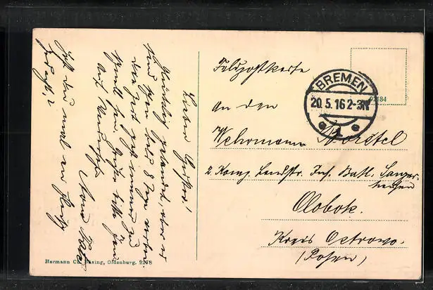 alte Ansichtskarte, gelaufen 1916 als Feldpost, Eckknicke li. unten u. re., Stempelspur, guter Zustand
