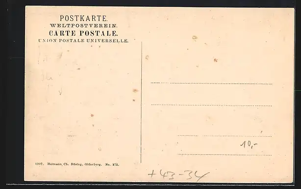 Personenbezogene Daten auf der Rückseite der Karte wurden durch blauen Textmarker unkenntlich gemacht. Die blauen Stellen sind auf die Vorderseite durchgeweicht und wirken sich negativ auf das Postkartenfoto aus
