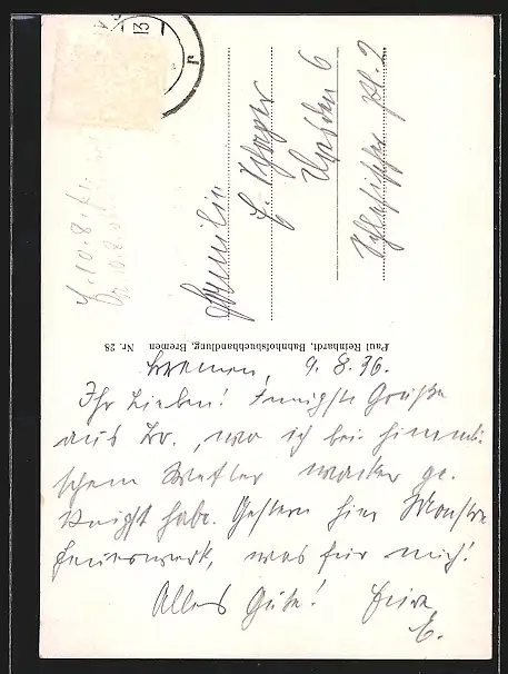 Personenbezogene Daten auf der Rückseite der Karte wurden durch blauen Textmarker unkenntlich gemacht. Die blauen Stellen sind auf die Vorderseite durchgeweicht und wirken sich negativ auf das Postkartenfoto aus