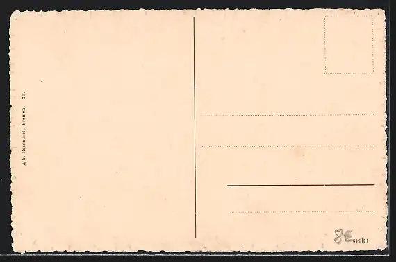 Personenbezogene Daten auf der Rückseite der Karte wurden durch blauen Textmarker unkenntlich gemacht. Die blauen Stellen sind auf die Vorderseite durchgeweicht und wirken sich negativ auf das Postkartenfoto aus