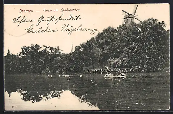 AK Bremen, Stadtgraben-Partie mit Windmühle