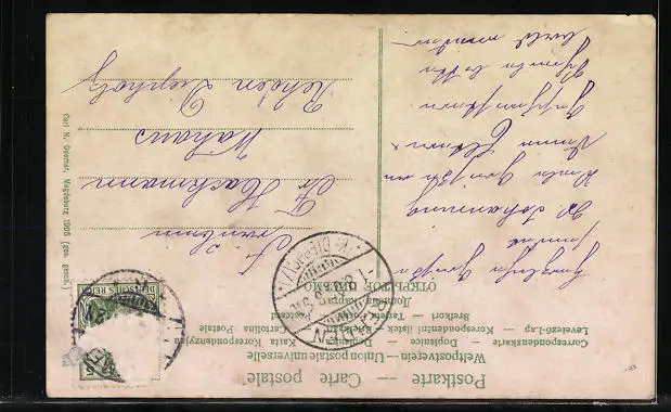 alte Ansichtskarte, gelaufen, Briefmarke entfernt, Abriebspur oben li., Bugspur oben re., guter Zustand