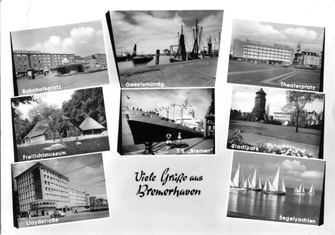 Ansichtskarte Bremerhaven sieben Abb., gestaltet Bahnhofsplatz, Geestemündung, Theaterplatz, Freilichtmuseum, T.S. Bremen, Stadtpark, Lloydstr., Segelyachten Erhaltung I-II, Beförderungsspuren postalisch gelaufen, gestempelt: Bremerhaven 1, 9.9.66 Verlag: Ingeborg Ahrens, Bremerhaven - 278 Der