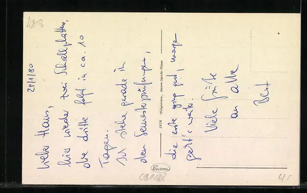 Personenbezogene Daten auf der Rückseite der Karte wurden durch blauen Textmarker unkenntlich gemacht. Die blauen Stellen sind auf die Vorderseite durchgeweicht und wirken sich negativ auf das Postkartenfoto aus