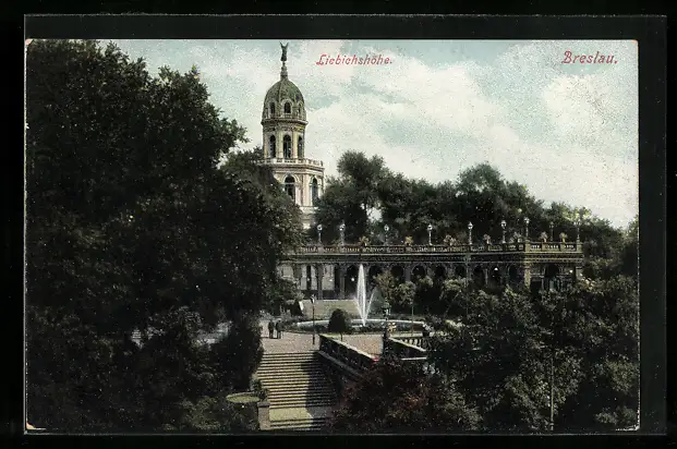 AK Breslau, Blick zur Liebichshöhe mit Springbrunnen