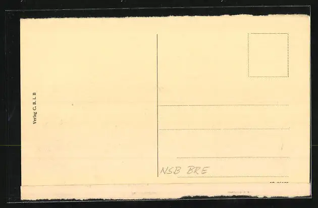 Personenbezogene Daten auf der Rückseite der Karte wurden durch blauen Textmarker unkenntlich gemacht. Die blauen Stellen sind auf die Vorderseite durchgeweicht und wirken sich negativ auf das Postkartenfoto aus