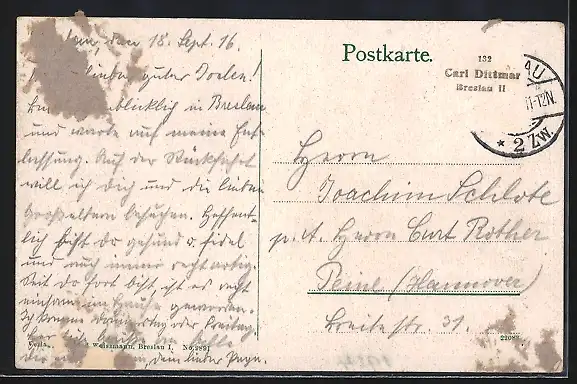 alte Ansichtskarte, gelaufen, Briefmarke entfernt, rückseitig Oberflächenschaden, rückseitig Klebe- und Papierreste, guter Zustand