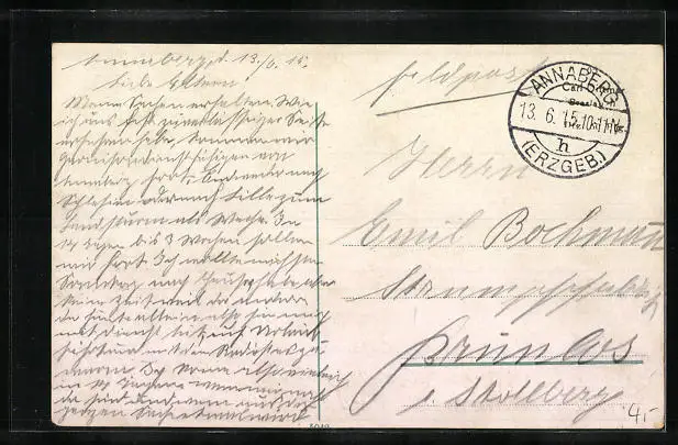 Personenbezogene Daten auf der Rückseite der Karte wurden durch blauen Textmarker unkenntlich gemacht. Die blauen Stellen sind auf die Vorderseite durchgeweicht und wirken sich negativ auf das Postkartenfoto aus