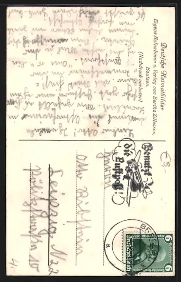 Personenbezogene Daten auf der Rückseite der Karte wurden durch blauen Textmarker unkenntlich gemacht. Die blauen Stellen sind auf die Vorderseite durchgeweicht und wirken sich negativ auf das Postkartenfoto aus