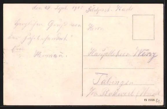 Personenbezogene Daten auf der Rückseite der Karte wurden durch blauen Textmarker unkenntlich gemacht. Die blauen Stellen sind auf die Vorderseite durchgeweicht und wirken sich negativ auf das Postkartenfoto aus