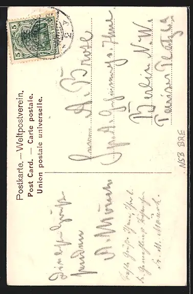 Personenbezogene Daten auf der Rückseite der Karte wurden durch blauen Textmarker unkenntlich gemacht. Die blauen Stellen sind auf die Vorderseite durchgeweicht und wirken sich negativ auf das Postkartenfoto aus