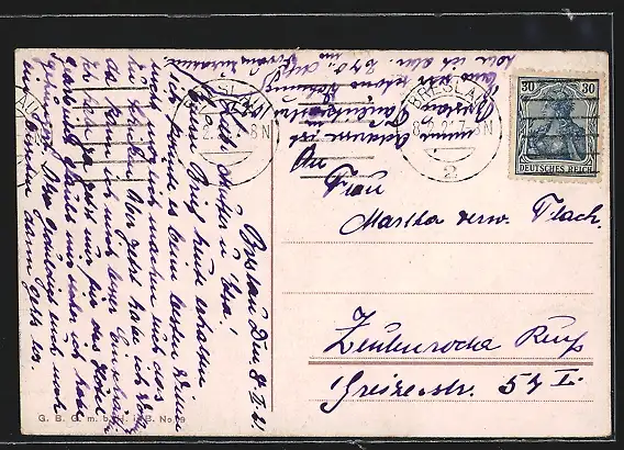 Personenbezogene Daten auf der Rückseite der Karte wurden durch blauen Textmarker unkenntlich gemacht. Die blauen Stellen sind auf die Vorderseite durchgeweicht und wirken sich negativ auf das Postkartenfoto aus
