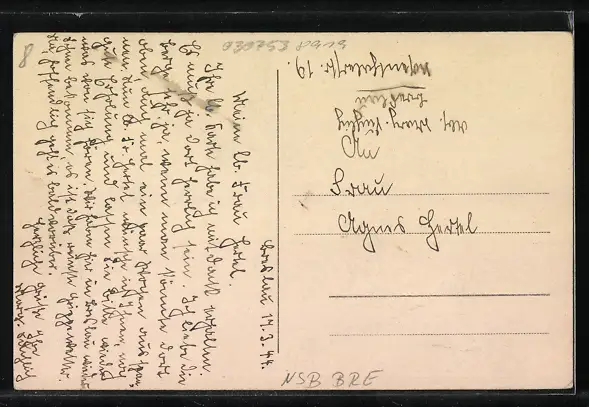 Personenbezogene Daten auf der Rückseite der Karte wurden durch blauen Textmarker unkenntlich gemacht. Die blauen Stellen sind auf die Vorderseite durchgeweicht und wirken sich negativ auf das Postkartenfoto aus