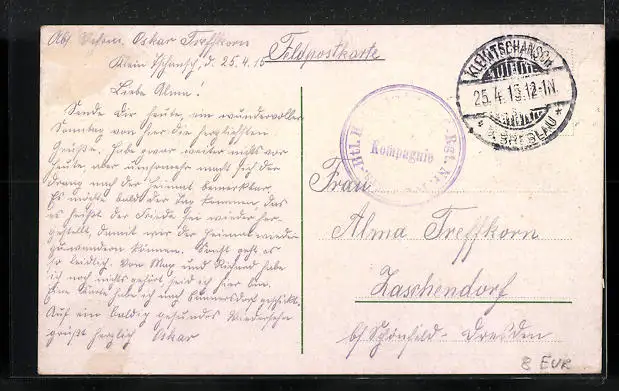 alte Ansichtskarte, gelaufen 1915 als Feldpost, rückseitig Klebe- und Papierreste, Stempelspur, guter Zustand