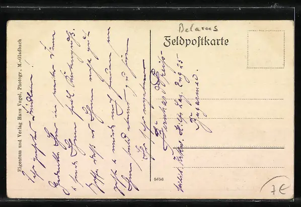 Personenbezogene Daten auf der Rückseite der Karte wurden durch blauen Textmarker unkenntlich gemacht. Die blauen Stellen sind auf die Vorderseite durchgeweicht und wirken sich negativ auf das Postkartenfoto aus