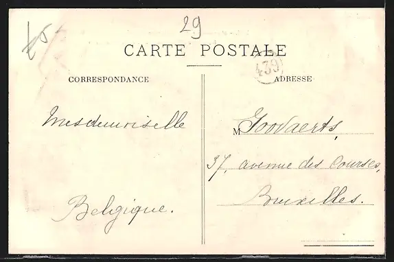 Personenbezogene Daten auf der Rückseite der Karte wurden durch blauen Textmarker unkenntlich gemacht. Die blauen Stellen sind auf die Vorderseite durchgeweicht und wirken sich negativ auf das Postkartenfoto aus