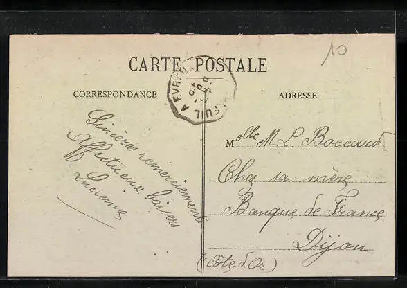 Personenbezogene Daten auf der Rückseite der Karte wurden durch blauen Textmarker unkenntlich gemacht. Die blauen Stellen sind auf die Vorderseite durchgeweicht und wirken sich negativ auf das Postkartenfoto aus