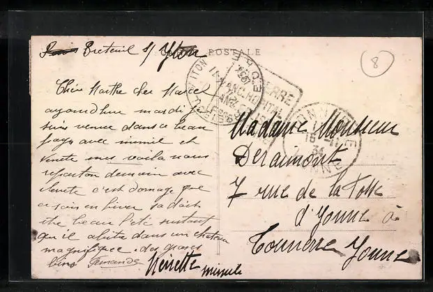 Personenbezogene Daten auf der Rückseite der Karte wurden durch blauen Textmarker unkenntlich gemacht. Die blauen Stellen sind auf die Vorderseite durchgeweicht und wirken sich negativ auf das Postkartenfoto aus
