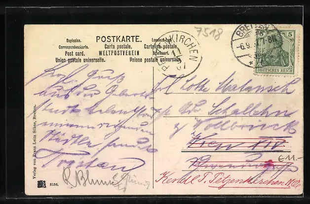 Personenbezogene Daten auf der Rückseite der Karte wurden durch blauen Textmarker unkenntlich gemacht. Die blauen Stellen sind auf die Vorderseite durchgeweicht und wirken sich negativ auf das Postkartenfoto aus