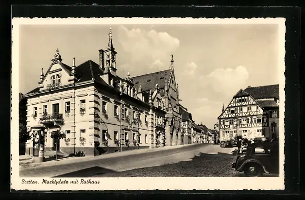 AK Bretten, Marktplatz mit Rathaus, Strassenpartie