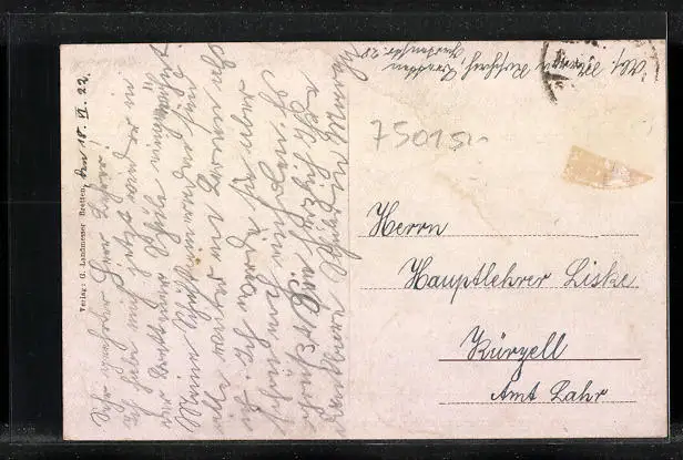 Personenbezogene Daten auf der Rückseite der Karte wurden durch blauen Textmarker unkenntlich gemacht. Die blauen Stellen sind auf die Vorderseite durchgeweicht und wirken sich negativ auf das Postkartenfoto aus