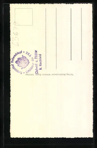 Personenbezogene Daten auf der Rückseite der Karte wurden durch blauen Textmarker unkenntlich gemacht. Die blauen Stellen sind auf die Vorderseite durchgeweicht und wirken sich negativ auf das Postkartenfoto aus