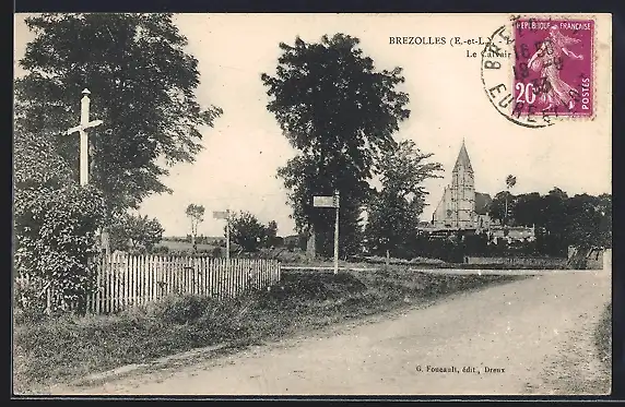 AK Brezolles, Le Calvaire et vue sur l`église entourée d`arbres