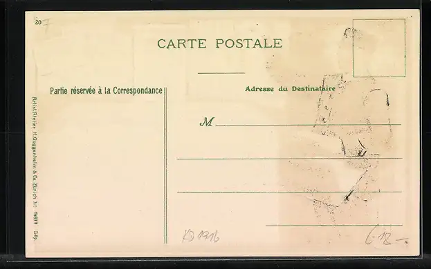 Personenbezogene Daten auf der Rückseite der Karte wurden durch blauen Textmarker unkenntlich gemacht. Die blauen Stellen sind auf die Vorderseite durchgeweicht und wirken sich negativ auf das Postkartenfoto aus