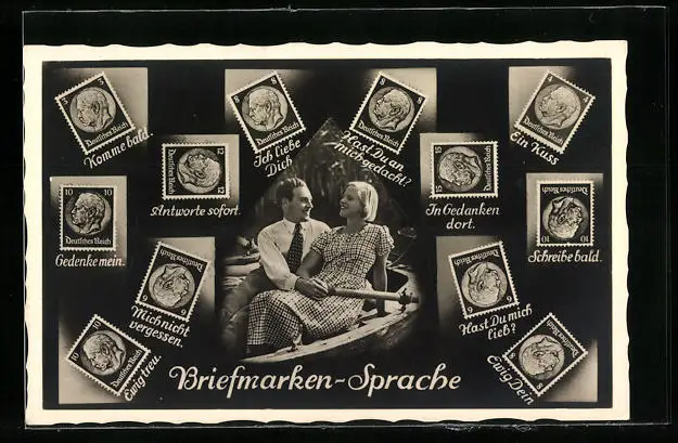 AK Briefmarkensprache, Ich liebe dich, Ein Kuss, Ewig dein
