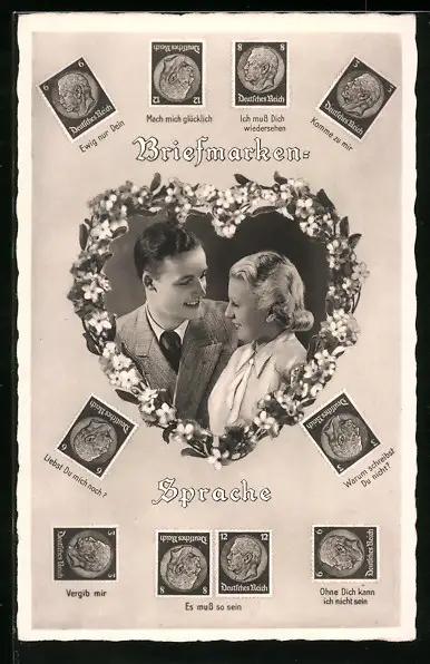 AK Briefmarkensprache, Mach mich glücklich, Komme zu mir, Es muss so sein, Paar im Herz