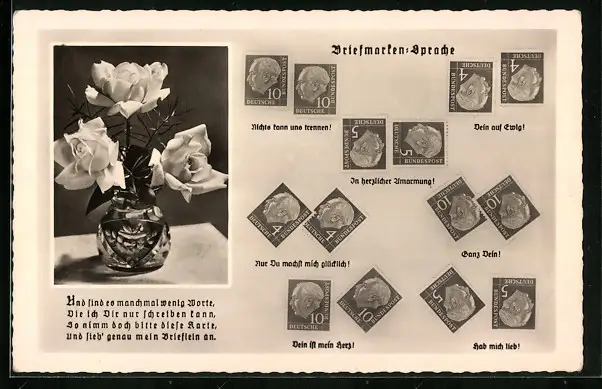 AK Briefmarkensprache, Rosen in Vase, Nichts kann uns trennen!
