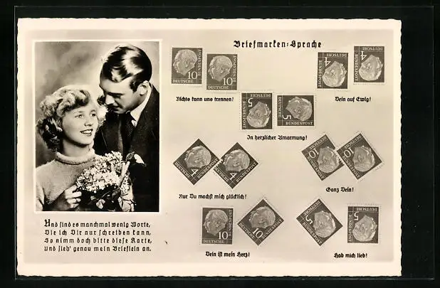 AK Briefmarkensprache mit jungem Paar mit Blumenstrauss