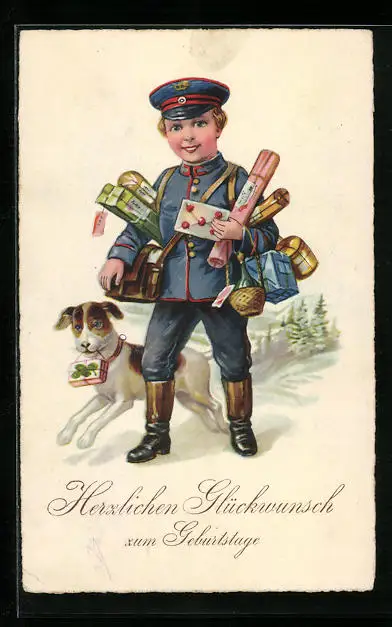 AK Briefträger mit Hund und Geschenken