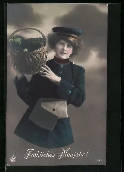 AK Briefträgerin mit Post und Sekt im Korb, Fröhliches Neujahr