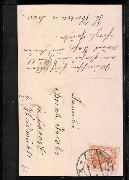 Personenbezogene Daten auf der Rückseite der Karte wurden durch blauen Textmarker unkenntlich gemacht. Die blauen Stellen sind auf die Vorderseite durchgeweicht und wirken sich negativ auf das Postkartenfoto aus