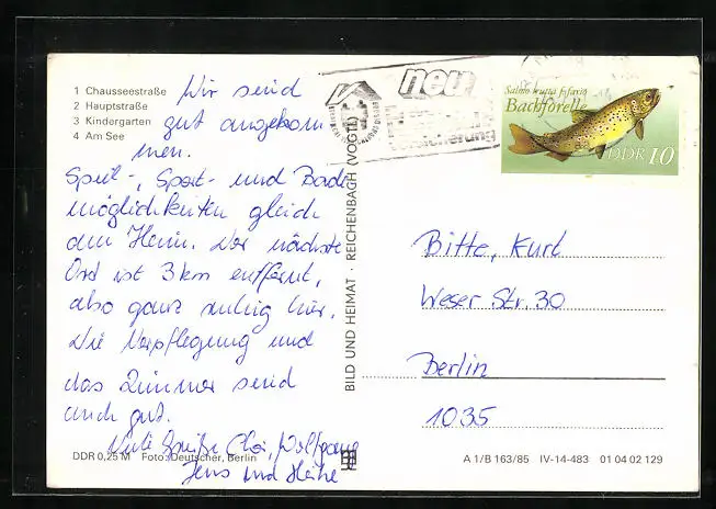Personenbezogene Daten auf der Rückseite der Karte wurden durch blauen Textmarker unkenntlich gemacht. Die blauen Stellen sind auf die Vorderseite durchgeweicht und wirken sich negativ auf das Postkartenfoto aus