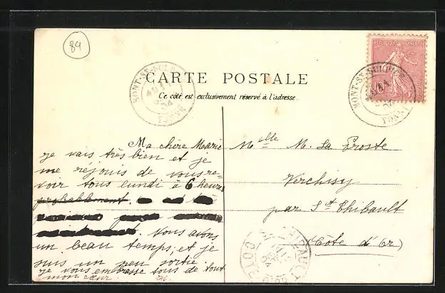 Personenbezogene Daten auf der Rückseite der Karte wurden durch blauen Textmarker unkenntlich gemacht. Die blauen Stellen sind auf die Vorderseite durchgeweicht und wirken sich negativ auf das Postkartenfoto aus