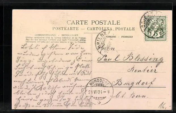 gelaufen 1904, Eckknick oben li., guter Zustand