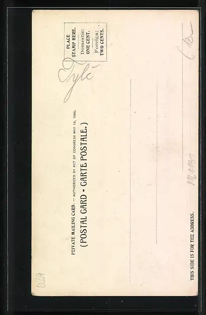 Personenbezogene Daten auf der Rückseite der Karte wurden durch blauen Textmarker unkenntlich gemacht. Die blauen Stellen sind auf die Vorderseite durchgeweicht und wirken sich negativ auf das Postkartenfoto aus