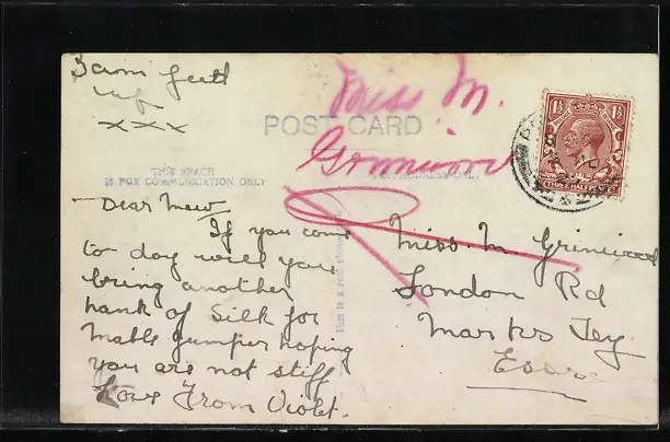 Personenbezogene Daten auf der Rückseite der Karte wurden durch blauen Textmarker unkenntlich gemacht. Die blauen Stellen sind auf die Vorderseite durchgeweicht und wirken sich negativ auf das Postkartenfoto aus