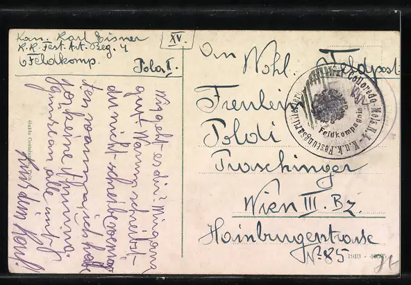 Personenbezogene Daten auf der Rückseite der Karte wurden durch blauen Textmarker unkenntlich gemacht. Die blauen Stellen sind auf die Vorderseite durchgeweicht und wirken sich negativ auf das Postkartenfoto aus