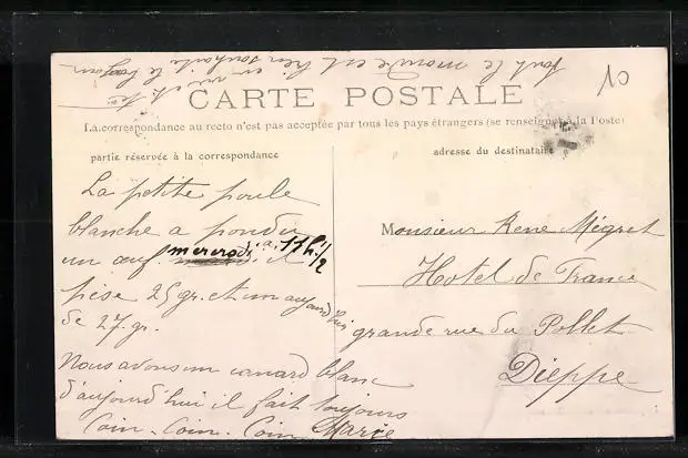 Personenbezogene Daten auf der Rückseite der Karte wurden durch blauen Textmarker unkenntlich gemacht. Die blauen Stellen sind auf die Vorderseite durchgeweicht und wirken sich negativ auf das Postkartenfoto aus