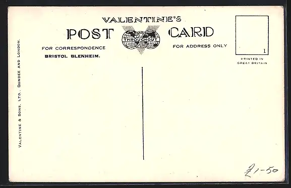 Personenbezogene Daten auf der Rückseite der Karte wurden durch blauen Textmarker unkenntlich gemacht. Die blauen Stellen sind auf die Vorderseite durchgeweicht und wirken sich negativ auf das Postkartenfoto aus