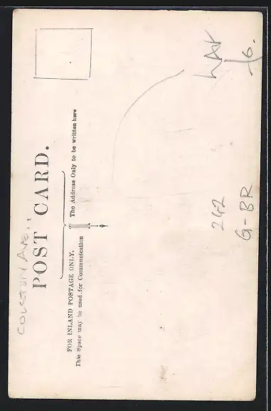 Personenbezogene Daten auf der Rückseite der Karte wurden durch blauen Textmarker unkenntlich gemacht. Die blauen Stellen sind auf die Vorderseite durchgeweicht und wirken sich negativ auf das Postkartenfoto aus