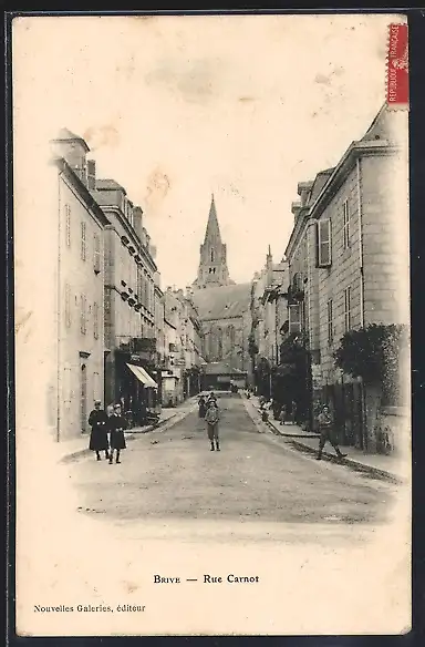 AK Brive, Rue Carnot avec vue sur l`église et passants animés