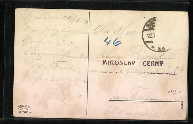 Personenbezogene Daten auf der Rückseite der Karte wurden durch blauen Textmarker unkenntlich gemacht. Die blauen Stellen sind auf die Vorderseite durchgeweicht und wirken sich negativ auf das Postkartenfoto aus