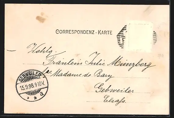 alte Ansichtskarte, gelaufen 1898, Briefmarke entfernt, rückseitig Oberflächenschaden, guter Zustand